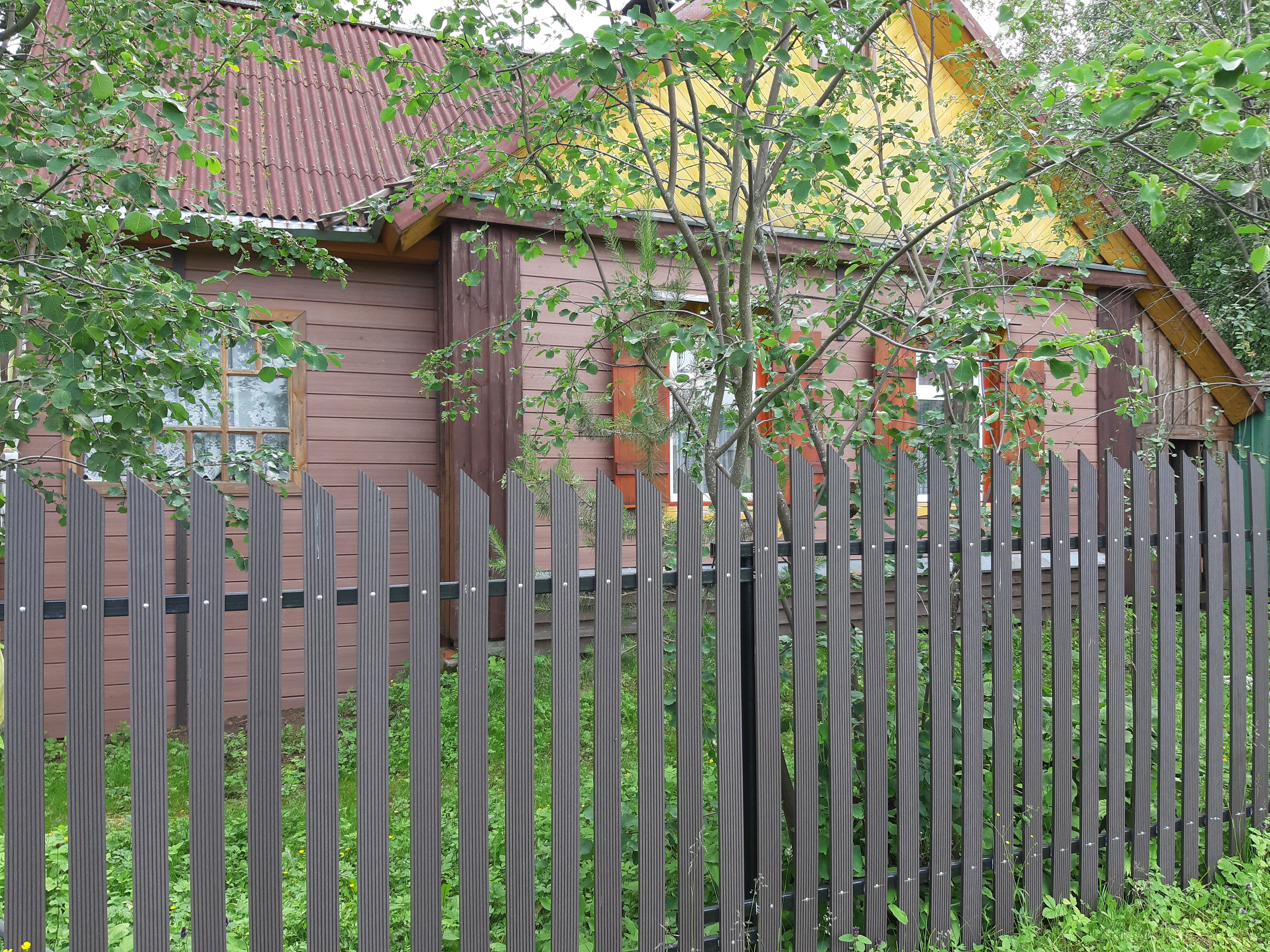 Для реализации этого проекта, нам понадобился специальный узкий полнотелый штакетник из ДПК. Ведь у владельца не так много времени посещать дачу и постоянно поддерживать деревянный штакетник в идеальной форме. Для ДПК-же такой уход не требуется и достаточно просто использовать по мере необходимости специальное средство для очистки ДПК и средство для защиты декинга. И он прослужит вам долгие годы не потребовав ничего дополнительно.